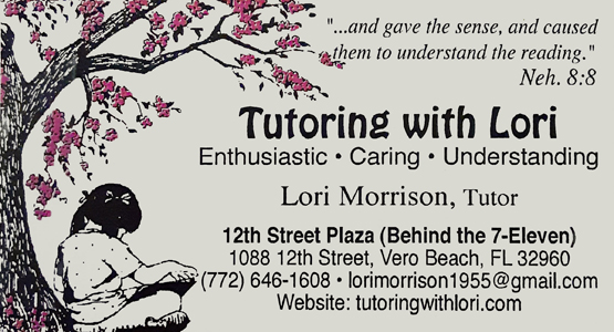 You can find Tutoring With Lori at the 12th Street Plaza, at the corner of 12th street and Old Dixie Hwy. Go all the way into the Plaza and turn left. Sign says "Tutoring" Vero Beach, Fl 32960 |